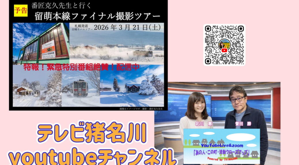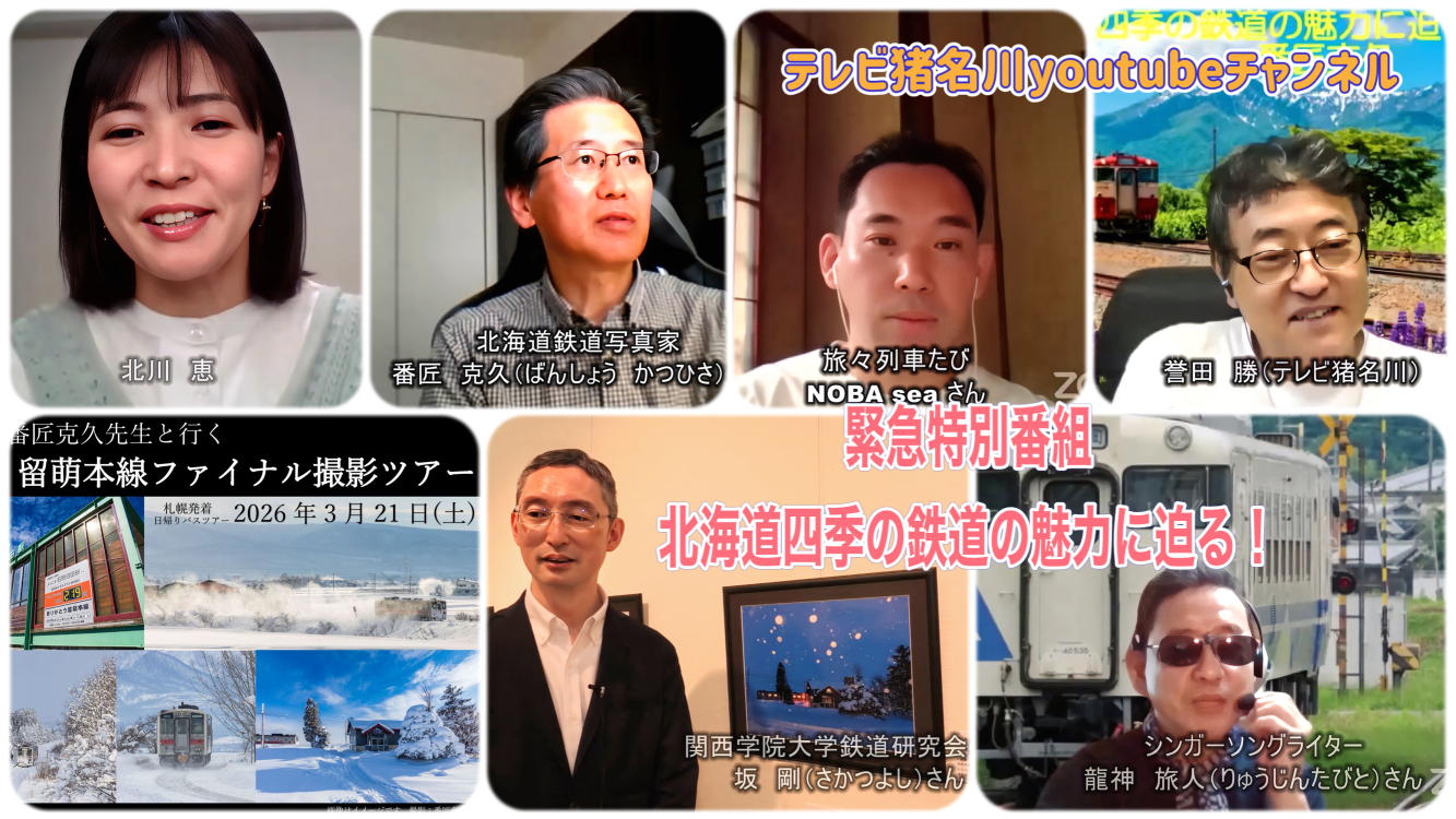 緊急特報です。テレビ猪名川、後援で、番匠克久先生と行く、留萌本線、ファイナル撮影ツアーをこの3月に開催いたします。 JR北海道の留萌本線は2016年に留萌~増毛間、2023年に石狩沼田~留萌間が廃止され、現在は深川~石狩沼田間(14.4km)を、残すのみになっていますが、この春2026年4月1日をもって残り区間が全線廃止となります。 前日の3月31日が列車の最終運行となりますが、その10日前の3月21日 土曜日に北海道を拠点に活動されておられる、鉄道写真家の、番匠克久先生のご案内で貸切バスで各撮影ポイントを訪ねます。 当日のスケジュールは、札幌現地集合、現地解散の日帰り貸切バスツアーとなり、募集定員は23名となっています。 札幌市内、午前9時集合、19時頃解散の予定です。詳細募集内容は主催の、名鉄観光サービス様より近日中に発表を予定しています。 鉄道写真家の番匠克久先生の活動については、引き続きこちらの緊急特別番組 北海道、四季の鉄道の魅力に迫るをご覧ください。(収録時間 48分)