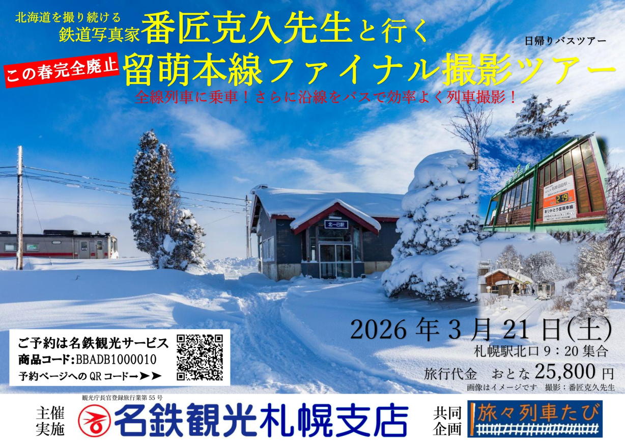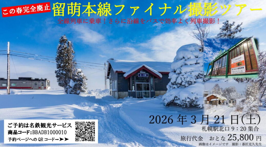 大変お待たせいたしました。予告から募集開始まで大変時間がかかってしまい申し訳ございません。テレビ猪名川後援、2026年3月21日(土) 「鉄道写真家番匠克久先生と行く留萌本線ファイナル撮影ツアー」《札幌駅北口集合・解散日帰り》の募集を開始いたしました。
